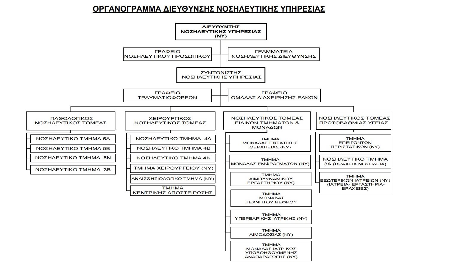 Η ΔΝΥ προΐσταται και οργανώνει με την ιεραρχική διοικητική συνεργασία όλο το νοσηλευτικό προσωπικό (Στρατιωτικό και Πολιτικό) του Νοσοκομείου, μέσω της υποστηρικτικής δομής του Γραφείου Νοσηλευτικού Προσωπικού της ΔΝΥ και αναλαμβάνει: